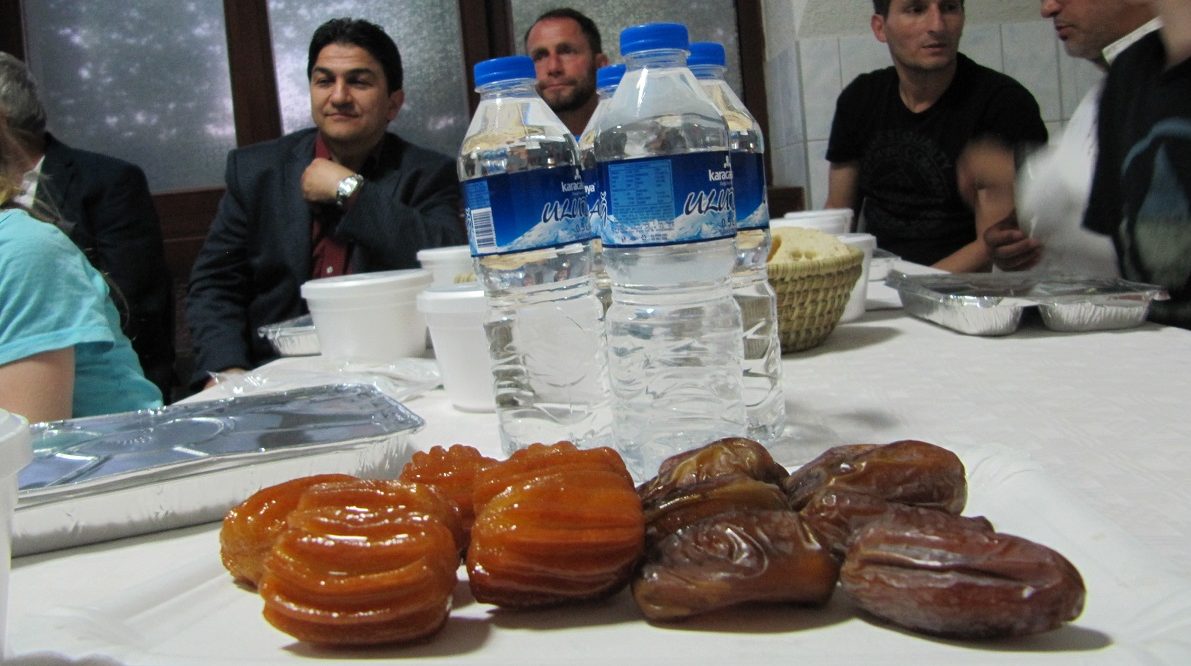 Als Dur feierlich das Fasten mit einer Sure beendet, eröffnen viele Männer und Frauen das Fastenbrechen mit einer Dattel. Das hat Tradition. Zudem gibt es eine Suppe mit roten Linsen, Reis, köstliches Rindfleisch mit Tomaten und Pilzen sowie Salat. Rührend kümmern sich die Gastgeber um das Wohl ihrer Gäste, verteilen weiter Schalen und Teller, reichen Wasser und Tee.