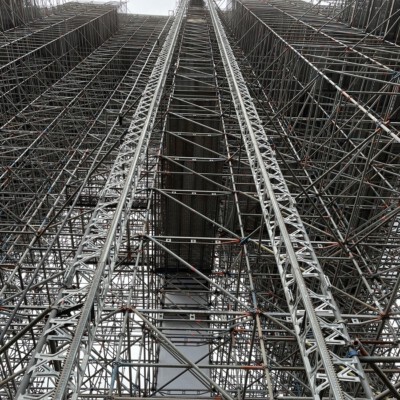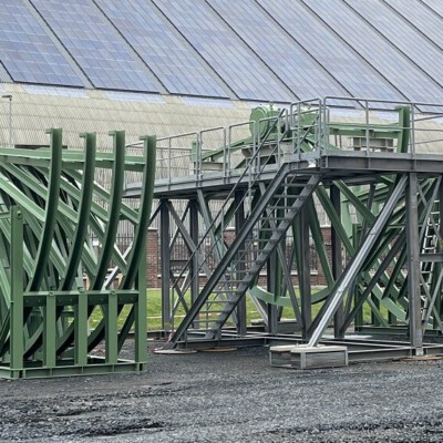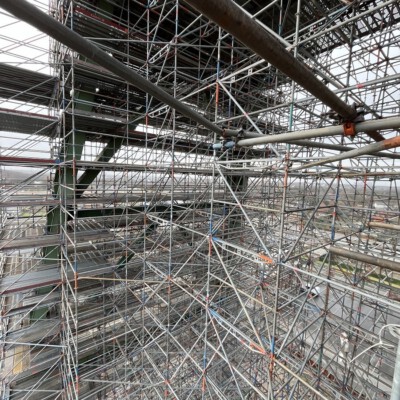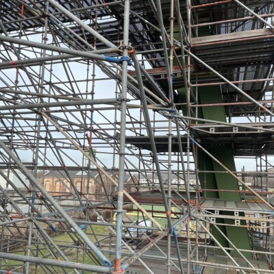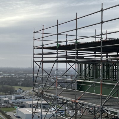 Kein Aufzug, kein Gerüst, keine Verkleidung: Der Förderturm wird in wenigen Wochen wieder so aussehen wie früher. Bis Ende Juni soll das Gerüst vollständig abgebaut sein, erklärte die RAG auf Nachfrage.