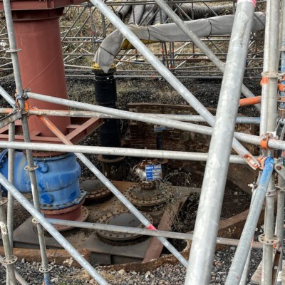 Somit stehen noch weitere Bauarbeiten an, die aber werden den Förderturm mich mehr entstellen. Zunächst geht es weiter mit der Errichtung des neues Schachtkellers, über den das Grubenwasser abgepumpt werden kann. Dazu werden die Schächte verfüllt und zugleich mit Hüllrohren ausgestattet, durch die dann die Pumpen in die Tiefe gelassen werden: jeweils drei Hüllrohre auf Lohberg 2 und unter dem bereits zurückgebauten Fördergerüst Lohberg 1, sechs weitere in Hünxe.