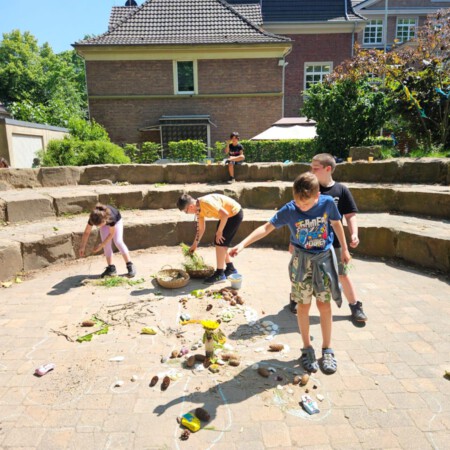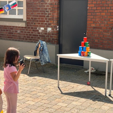 Für die Kinder gab es Spielstationen, die zum Mitmachen einluden: Sackhüpfen, Dosenwerfen, Naturmandalas legen oder Flaggen ausmalen – alles mit viel Freude, Neugier und einem kleinen Augenzwinkern. Und weil das Wetter wunderbar mitspielte, wurde der Schulhof kurzerhand zum Ort der Begegnung.