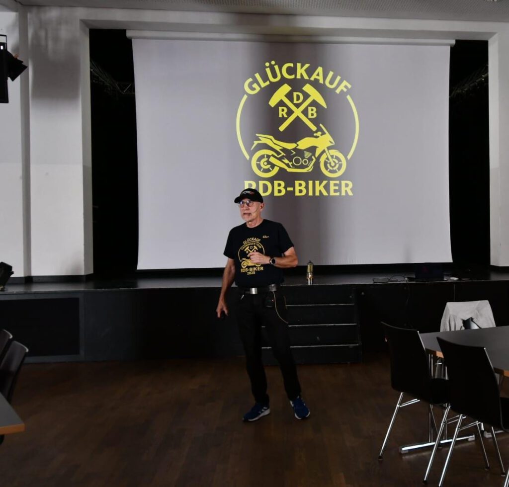 Im Festsaal begann pünktlich um 17 Uhr der Reisebericht der RDB-Motorradgruppe. In einer reich bebilderten Präsentation stellten die Biker ihre Thüringen-Tour vor, mit Eindrücken von Landschaft, Kultur und natürlich den gefahrenen Strecken. Das Publikum folgte aufmerksam und dankte mit herzlichem Applaus.