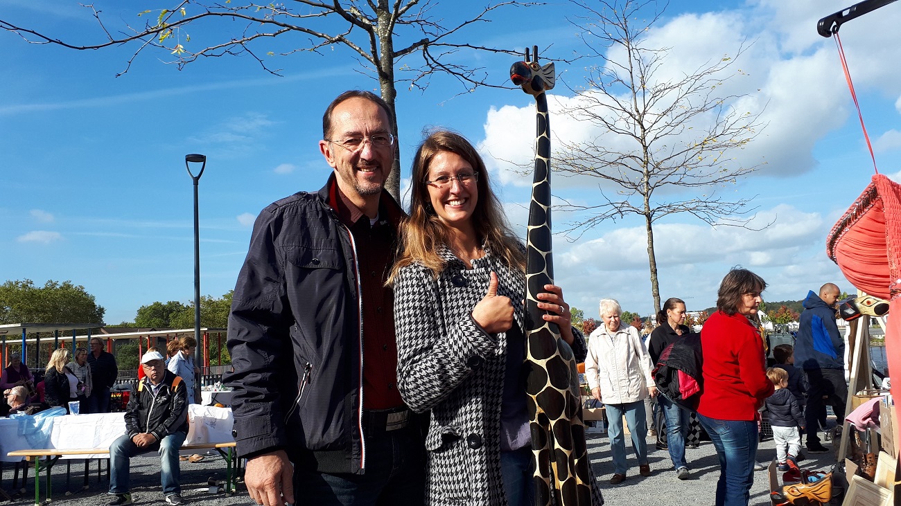 - Giuseppe und Dominique mit ihrem neuen Stolz: einer großen Giraffe.