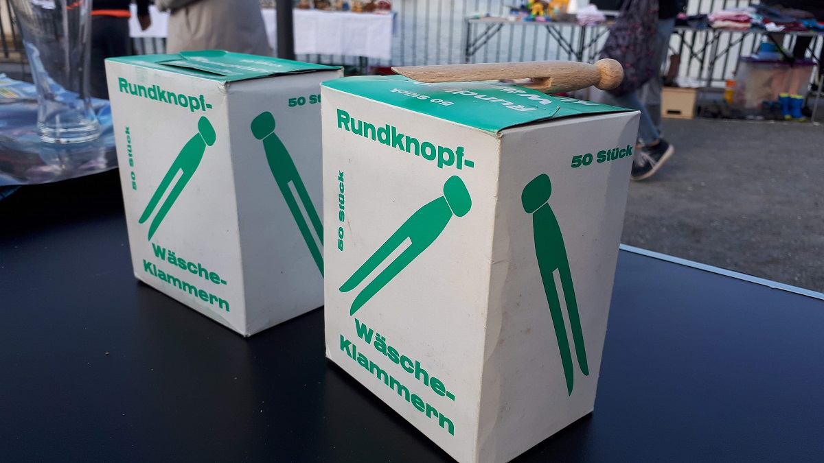 „Wenn das so weiter geht, ziehen sich die Stände bald bis auf die andere Seite des Weihers“, vermutet Guido, der an seinem Stand wunderschöne Retro-Alltagsgegenstände anbietet, zum Beispiel eine Kaffeemühle oder Edeka-Sammelbilder aus den 60ern. Auf besonders großes Interesse stoßen die Rundkopf-Wäscheklammern – die Schachtel noch mit einem Preisetikett von 2,75 DM ausgezeichnet.