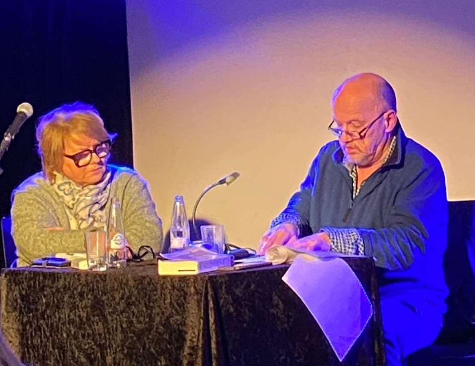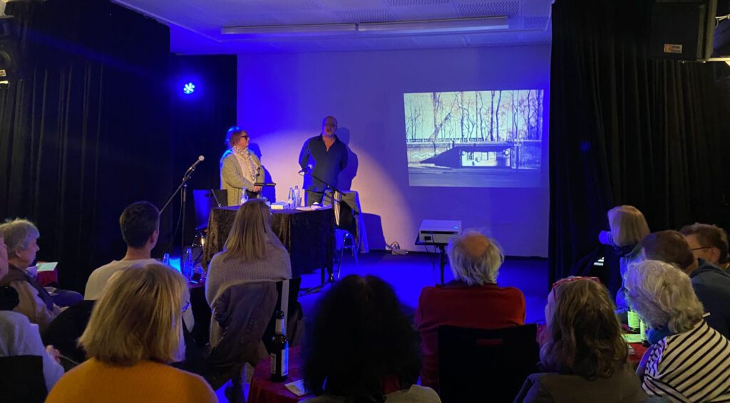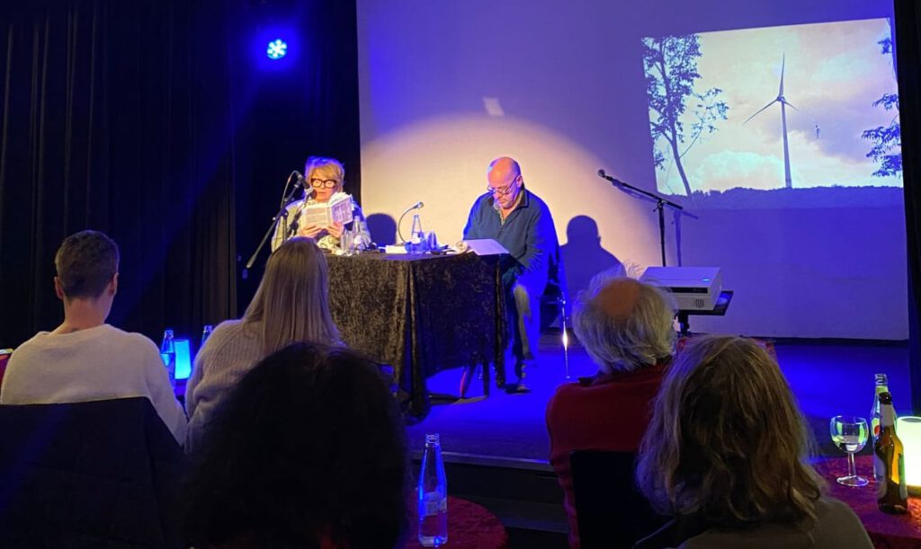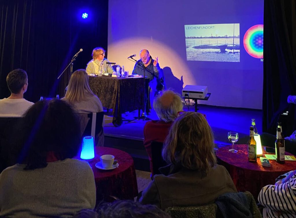 Das Autorenteam, bestehend aus Jens E. Gelbhaar und Mart Wolff (Nom de Plume), bahnt sich pünktlich seinen Weg auf die Bühne. “Wir haben heute erst in einem Telefonat besprochen, wie wir das hier heute Abend machen.”, gesteht Gelbhaar.
