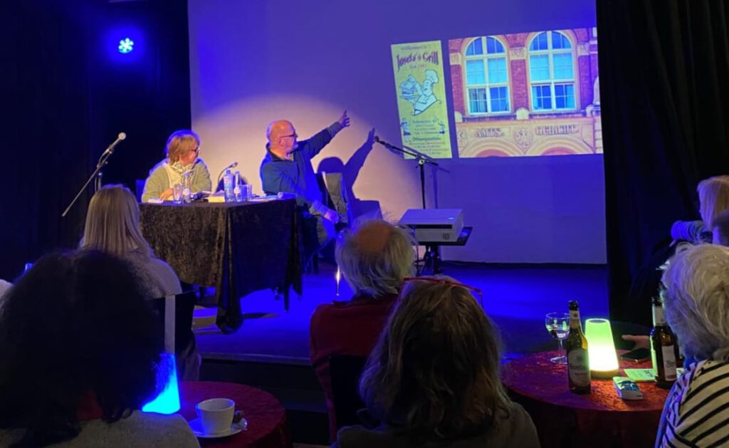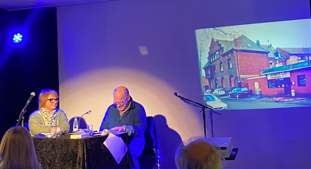 Er eröffnet die Lesung, indem er ein Foto des historischen Kiosks an der Hünxer Straße an die Bühnenrückwand beamt, er freut sich, dass es die heutige Blaue Bude noch gibt.