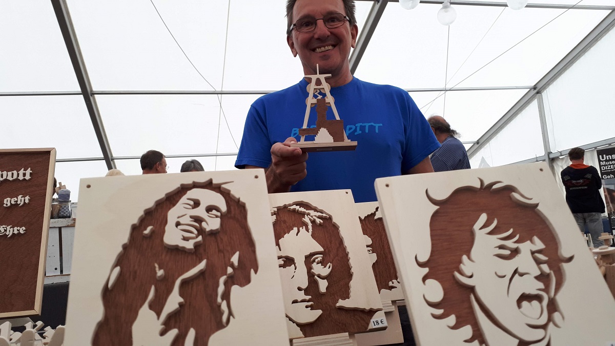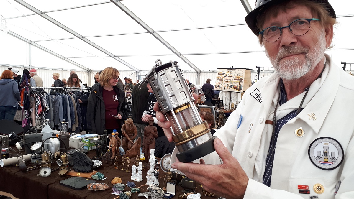 Herzstück des Programms war neben der Bühne der Reviermarkt, für das die Veranstalter von Stiftung Ledigenheim und DIN-Event eigens ein 20 mal 30 Meter großes Zelt aufgebaut hatten. Dort zeigten etwa 25 Aussteller ihre Schätze aus der Tradition des Bergbaus, angefangen bei seltenen Grubenlampen bis zu Fachliteratur, Mineralien oder aus Kohle gefertigtem Schmuck.
