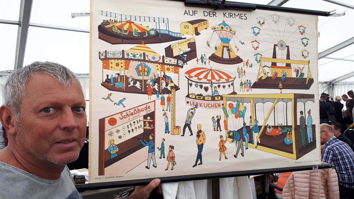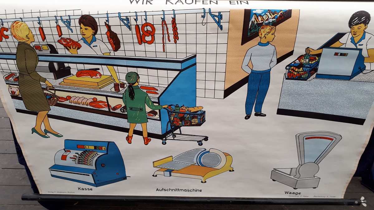 - Ein echter Hingucker, obwohl nicht direkt aus dem Stollen: Die Schulkarten aus den 50ern zubestimmten Alltagsthemen, hier etwa: „Wir kaufen ein.“