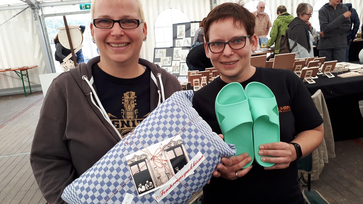 - Wer kann da widerstehen? Original-Schlappen vom Pütt, dazu ein handgefertigtes Kissen mit dem Schriftzug „Fensterrausguckkissen“. Chapeau, Nadine Melsa und Yvonne Klabunde!.