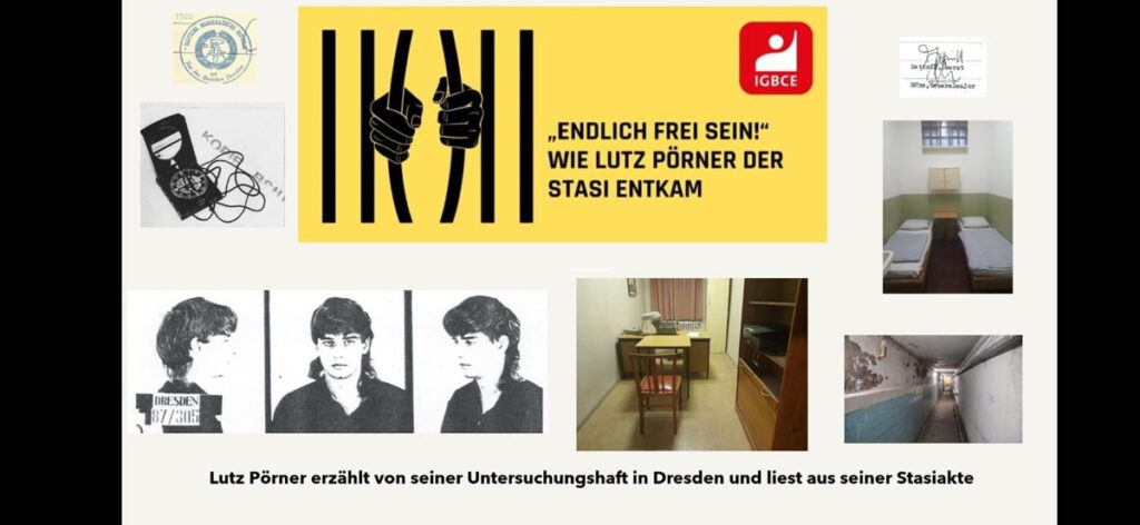 Berichten wird der Zeitzeuge Lutz Pörner, der eindrücklich über seine Jugend und sein Leben in der ehemaligen DDR sowie seine monatelange Untersuchungshaft bei der Stasi‑Bezirksverwaltung in Dresden berichtet.