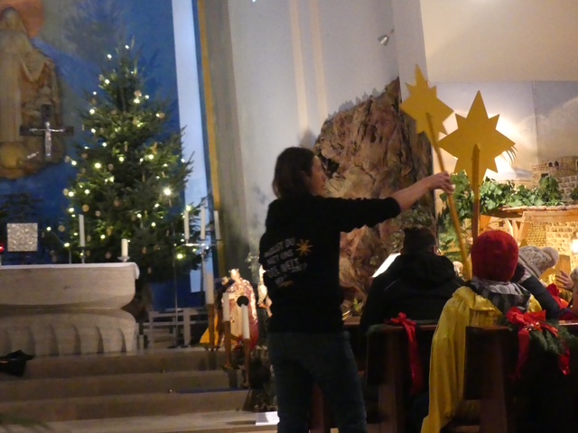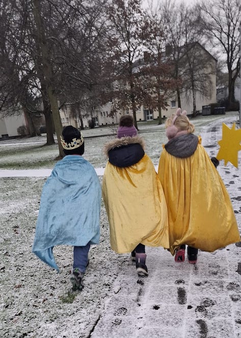 Dort sprach Diakon van Meerbeck mit den Kindern nochmal über ihr großartiges Vorhaben. Als Heilige Drei Könige ausstaffiert würden sie sich auf den Weg machen, den Neujahrssegen in die Wohnungen und Häuser zu bringen. Gleichzeitig würden Spenden gesammelt. Die Kinder wussten von den Vorbereitungstreffen, dass die Spenden in diesem Jahr besonders dafür genutzt werden, Kinder ( in diesem Jahr war das Beispielland Bangladesh) von ihrer schweren, teilweise gefährlichen Arbeit zu befreien. Eine Kindheit ohne Arbeit, mit Schule, Freizeit und Erholung soll so möglichst vielen ihrer Altersgenossen endlich ermöglicht werden.