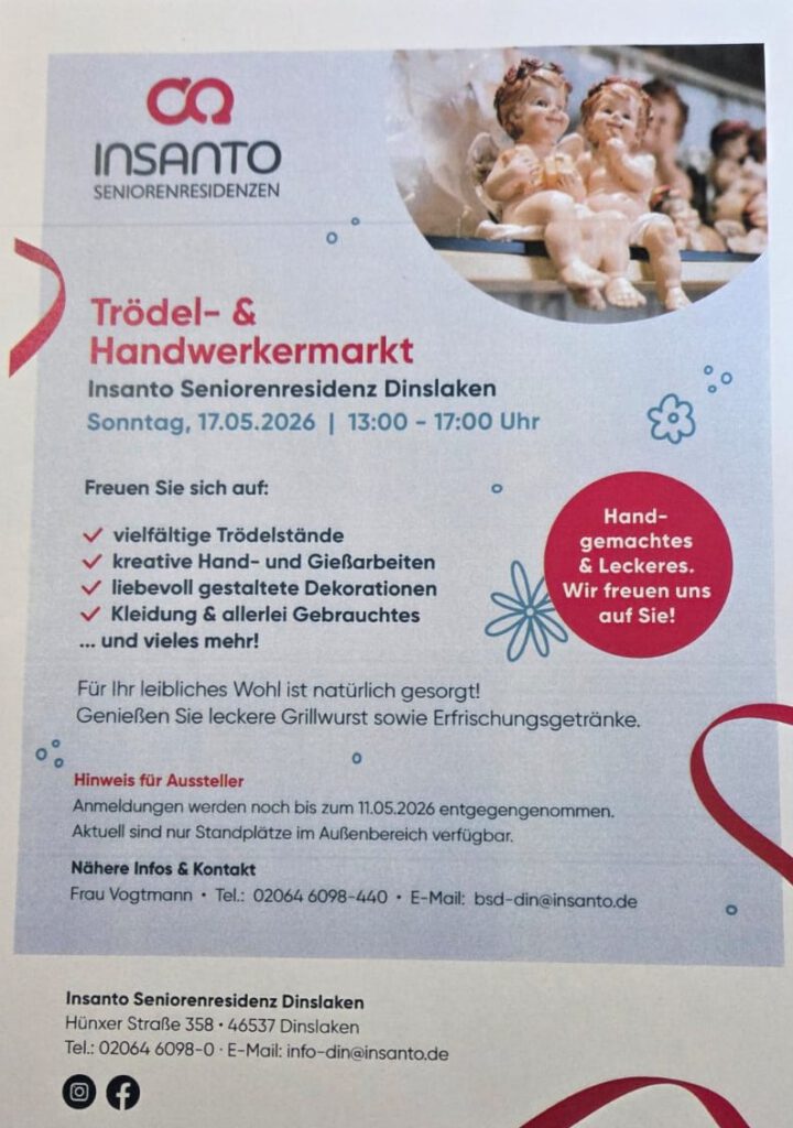 Ein gemütlicher Sonntagsausflug für die ganze Familie steht vor der Tür! Am Sonntag, den 17. Mai 2026, verwandelt sich die Insanto Seniorenresidenz Dinslaken (Hünxer Straße 358) in ein buntes Paradies für Schnäppchenjäger und Liebhaber von Handgemachtem.