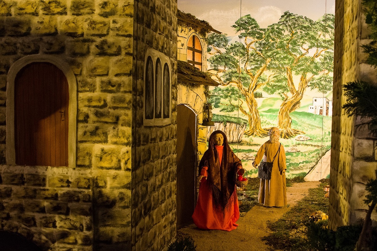 Nicht nur die Figuren sind beeindruckend, auch die liebevoll gestaltete Landschaft ist einzigartig. Die Wände wurden vom Künstler Ludger Kinold im Sauerland bemalt und aufwändig nach Lohberg transportiert. Sie erwecken den Eindruck man könne aus der dargestellten Stadt hinaus kilometerweit in die Landschaft schauen.Ein kleier See, an dem die Hirten verweilen, ein plätschernder Wasserfall-all das macht die Krippe lebendig.Und sie ist wirklich in Bewegung:Immer wieder wird umgebaut, entsteht ein neues Bild.Mit viel Liebe zum Detail werden unterschiedliche Szenen aus der Zeit um Jesu Geburt dargestellt.