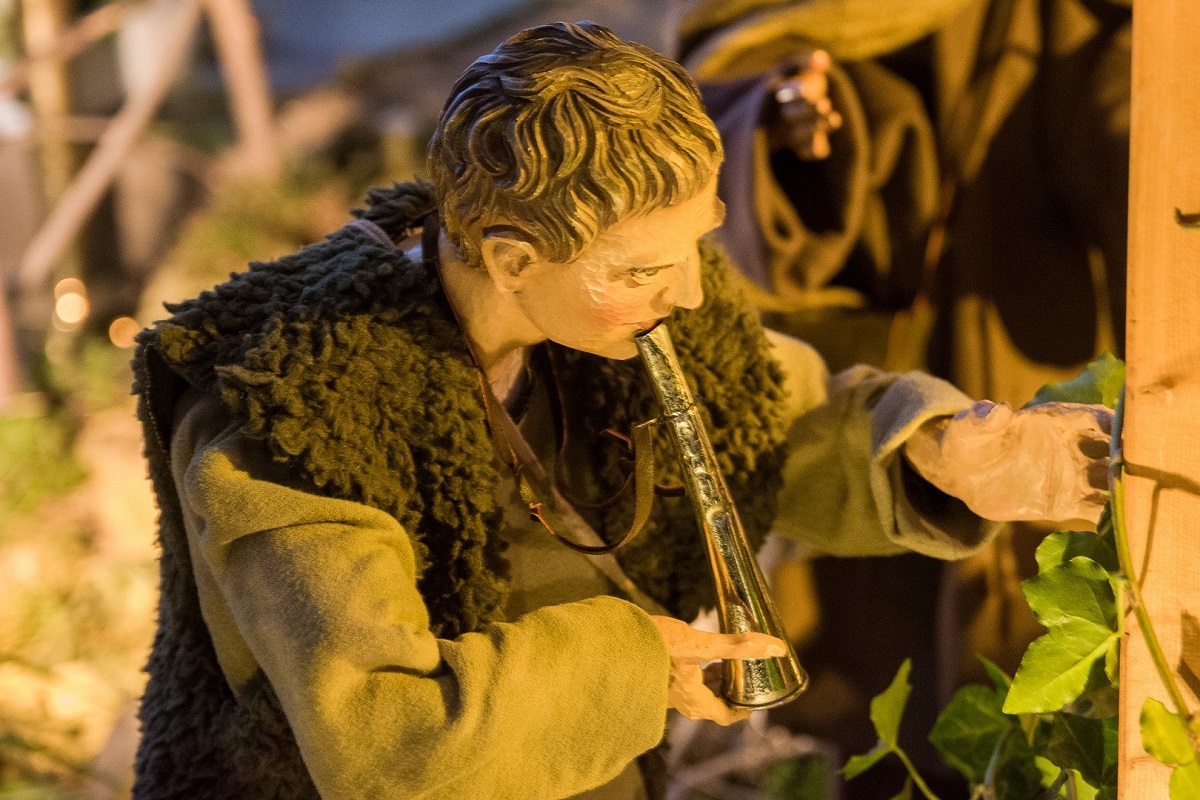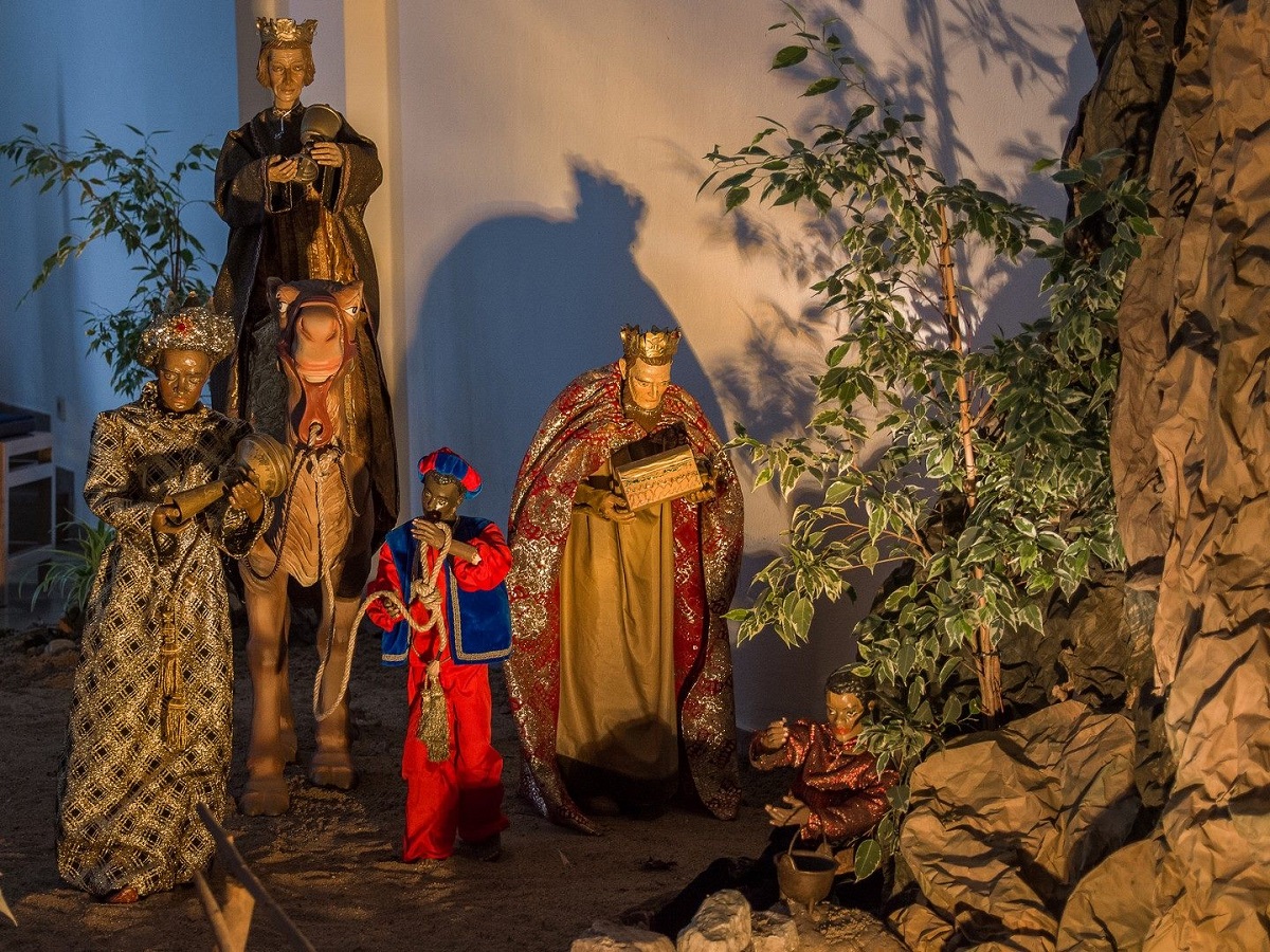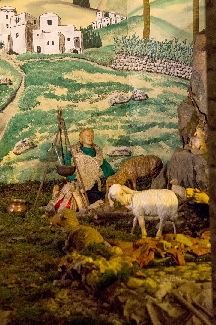 Vorsichtig klettere ich über eine kleine Leiter hinauf und stehe neben meterhohen künstlichen Felsen.Über einen Sandweg gelange ich sozusagen in den Backstage-Bereich. Dort wo sonst an Werktagen Gottesdienst gefeiert wird,stehen jetzt jede Menge Kisten mit Elektrokabeln, Engelsflügeln, Hirtenbekleidung und Königsgewändern-und die Figuren.