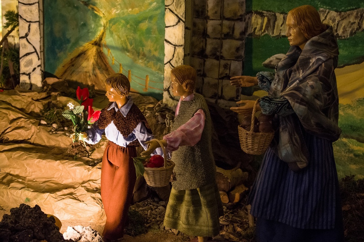Drei Tage vor Heiligabend herrscht in der Marienkirche in Lohberg reges Treiben: Die Krippe wird aufgebaut! Zugegeben, die Bezeichnung „Krippe“ ist eindeutig untertrieben,denn es ist eine ganze Krippenlandschaft, die hier entstanden ist. An die 50m² der Kirche haben sich in eine biblische Landschaft verwandelt.Einige Mitglieder des Krippenkreises sind damit beschäftigt,die liebevoll gestalteten,ca.80 cm.großen Figuren einzukleiden- und ich darf hautnah dabei sein!